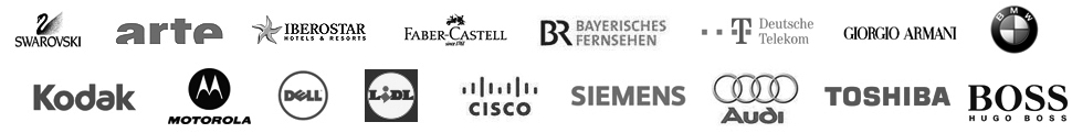 | Faber-Castell, Stein-Nuremberg (Germany) | Fiagon Navigationssysteme, Berlin (Germany) | Foodsaver, Jarden Consumer Solutions, Miami, FL (USA) | Gaerner, Duisburg (Germany) | Geofotografia, Braga (Portugal) | Giorgio Armani, Milan (Italy) | GW Cosmetics GmbH,Vienna (Austria) | Hohes C, Mainz (Germany) | Hospital Inca, Majorca (Spain) | HR Radio Hessen, Francfort/Main (Germany) | Hugo Boss, Metzingen (Germany) | Human Network International e.V., Munich (Germany) | Iberostar, Majorca (Spain) | Imetec, Bergamo (Italy) | INAH - Museo de Antropología e Historia, Mexico-City (Mexico) | INDOC Industrie- und Fernsehfilm GmbH, Munich (Germany) | Informa VBC, Munich (Germany) | Klett Verlag, Stuttgart (Germany) | Kodak, Rochester-New York (USA) | Kompogas, Glattbrugg (Switzerland) | Kreis für geistige Lebenshilfe, Kirchhundem (Germany) | Langenscheidt Verlag, Munich/Berlin (Germany) | Le Saunier de Camargue, Camargue (France) | Libertad Digital Radio, Madrid (Spain) | Lidl, Neckarsulm (Germany) | Ligeresa Kraft Foods Deutschland, Bremen (Germany) | Lindam, Wetherby (England) | Linkedin, Mountain View, California (USA) | Logitech Europe, Morges (Switzerland) | Lorenz Kunststofftechnik, Wallenhorst - Hollage (Germany) |